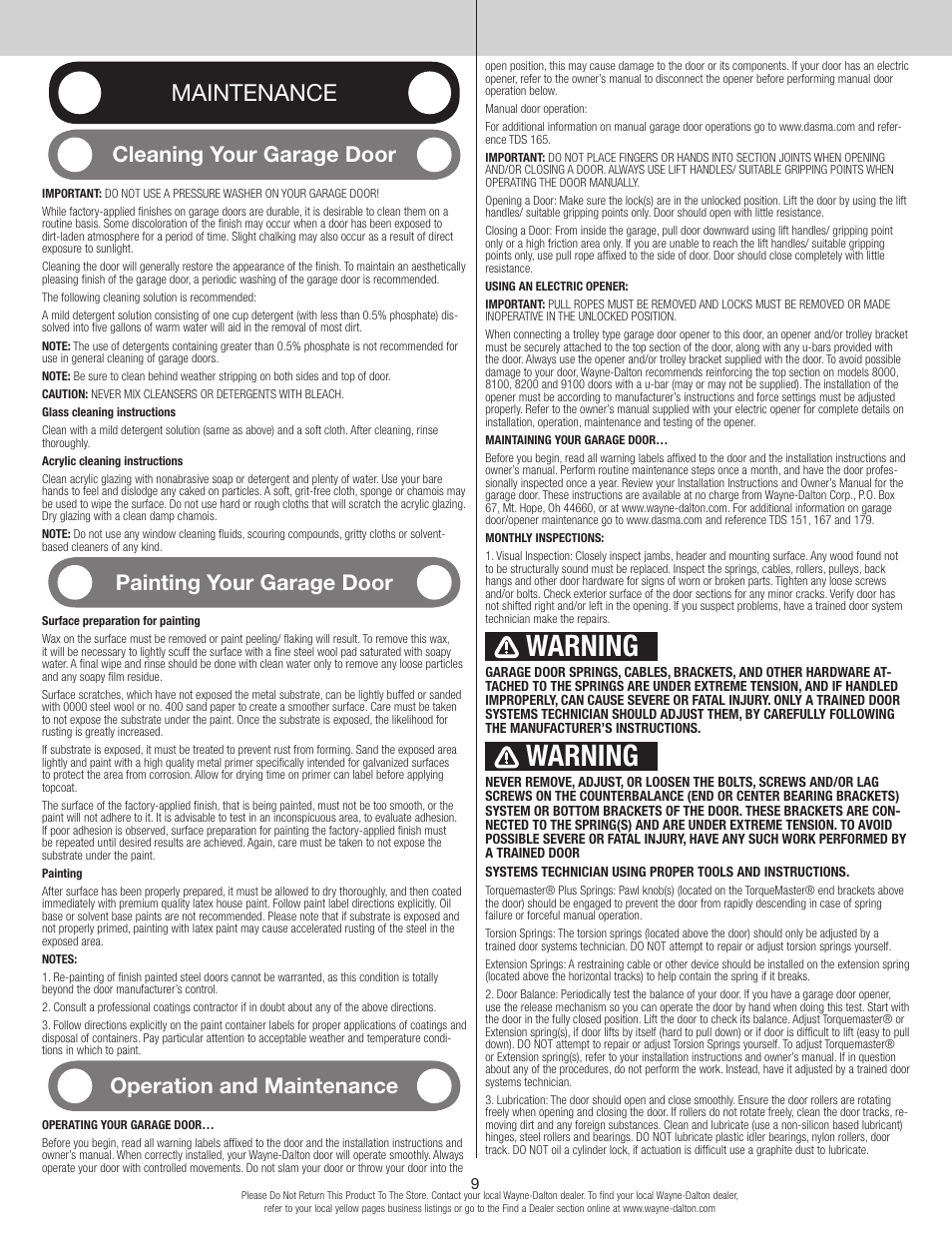 Warning Maintenance Cleaning Your Garage Door Wayne Dalton Torquemaster 9600 User Manual Page 9 12